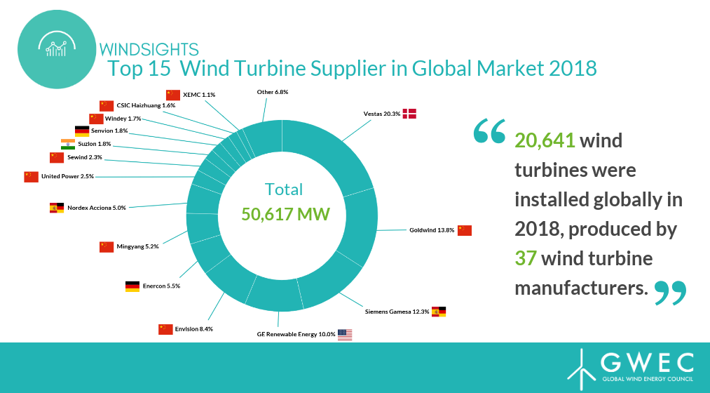 雖然維斯塔斯,西門子歌美颯和通用電氣可再生能源等知名公司占據了前五位,但GWEC的報告顯示,2018年前15大風電機制造商中有一半以上位于中國。