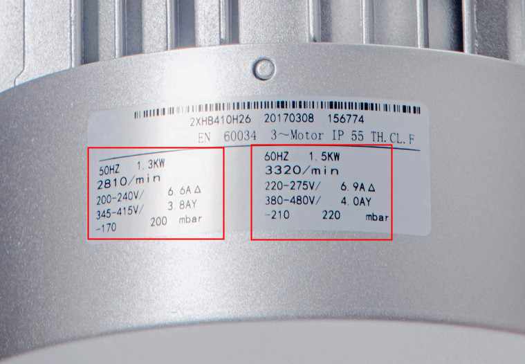 通常國(guó)內(nèi)的鼓風(fēng)機(jī)標(biāo)注得為50HZ和60HZ兩種,這是因?yàn)椋姍C(jī)部分采用的國(guó)標(biāo)寬電壓的配置。而國(guó)外的有的時(shí)候標(biāo)準(zhǔn)的為三種。